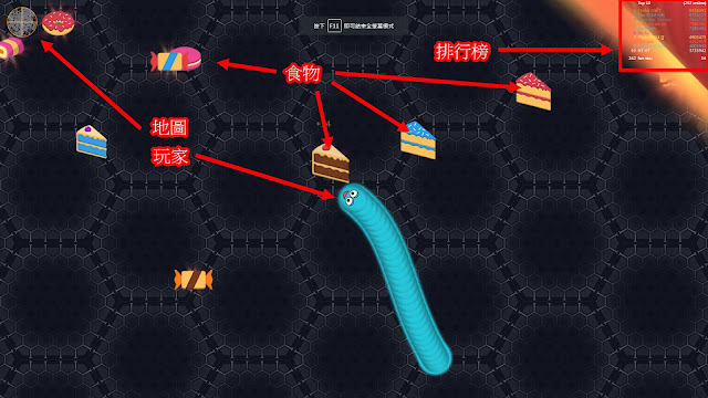 另外在排行榜中,可以看見玩家的排行及攝取食物後的能量,在遊戲中,按住滑鼠左鍵可以加快爬行速度,加速時則會持續消耗能量。